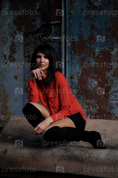 Девушка позирует у разрушенного здания