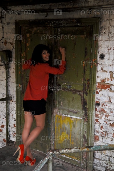 Девушка позирует у разрушенного здания