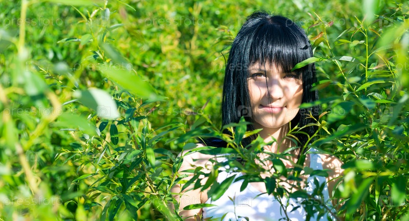 Красивая девушка в зеленой листве