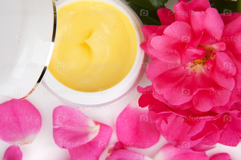 Банка с косметическим кремом и розовые лепестки