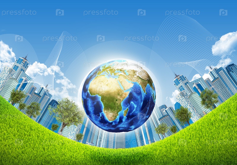 Земля, зеленая трава и небоскребы