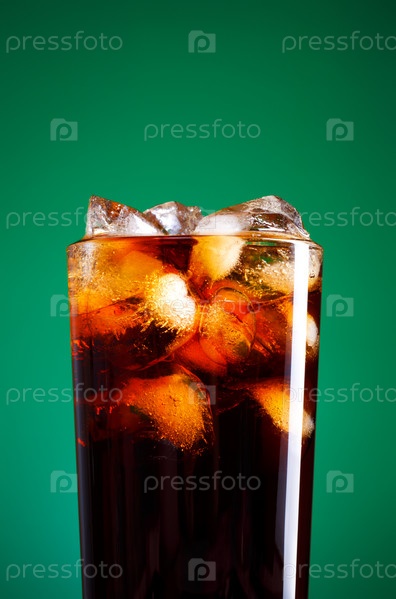 Стакан колы со льдом на зеленом фоне