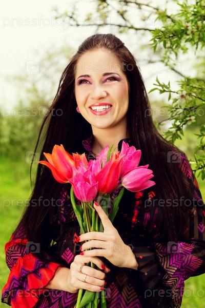 Молодая счастливая женщина с букетом тюльпанов на природе
