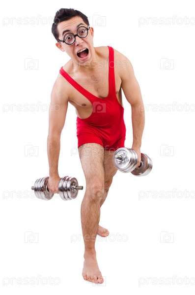 Забавный парень с гантелями