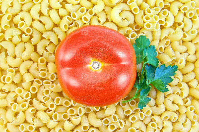 Композиция из желтых рожек с целым помидором и веточкой петрушки