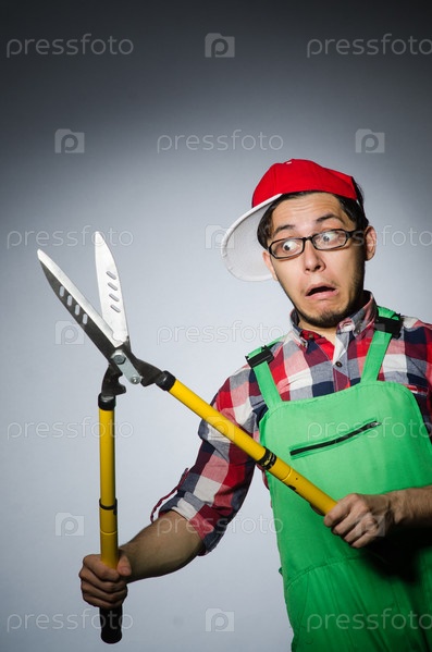 Смешной мужчина с секатором