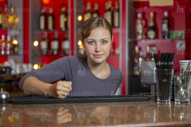 Девушка стучит по стойке бара