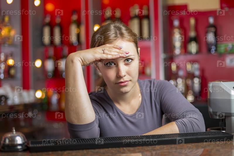 Уставшая девушка за стойкой