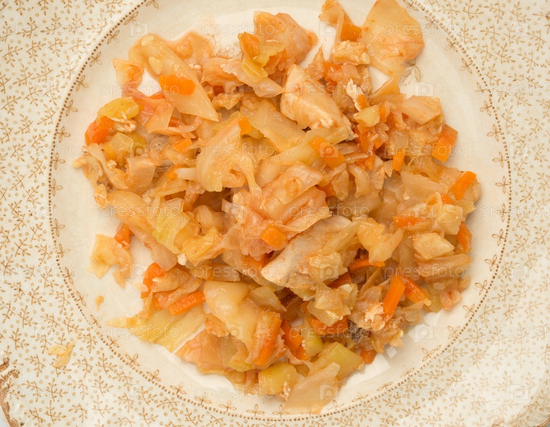 Тушеная капуста с курицей, луком и травами
