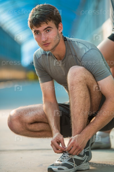 Мужчина зашнуровывает кросовки