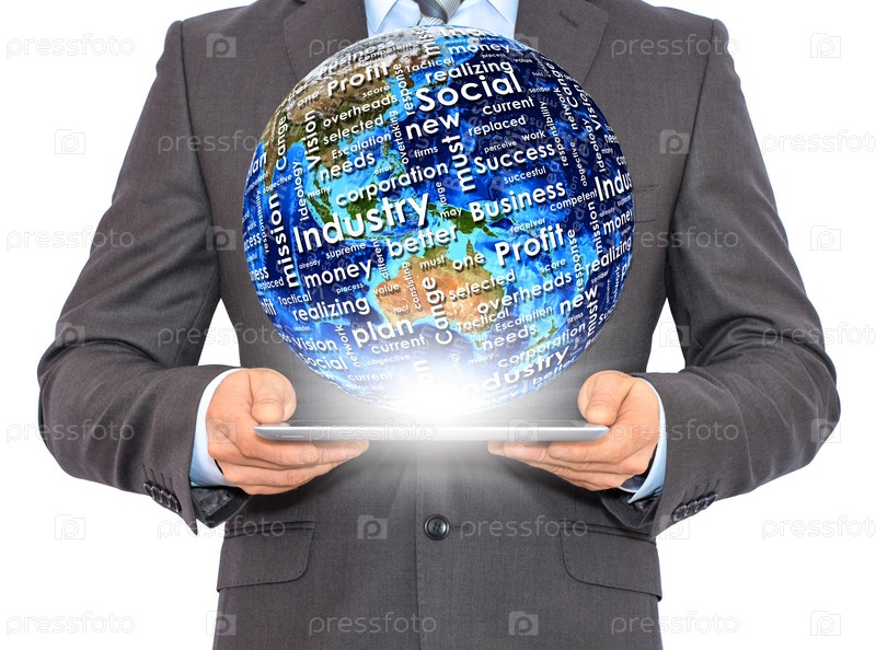 Бизнесмен держит планшет и Землю