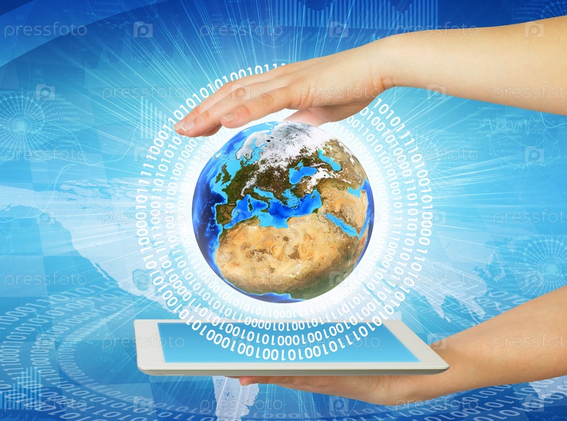 Бизнесмен держит планшет и Землю