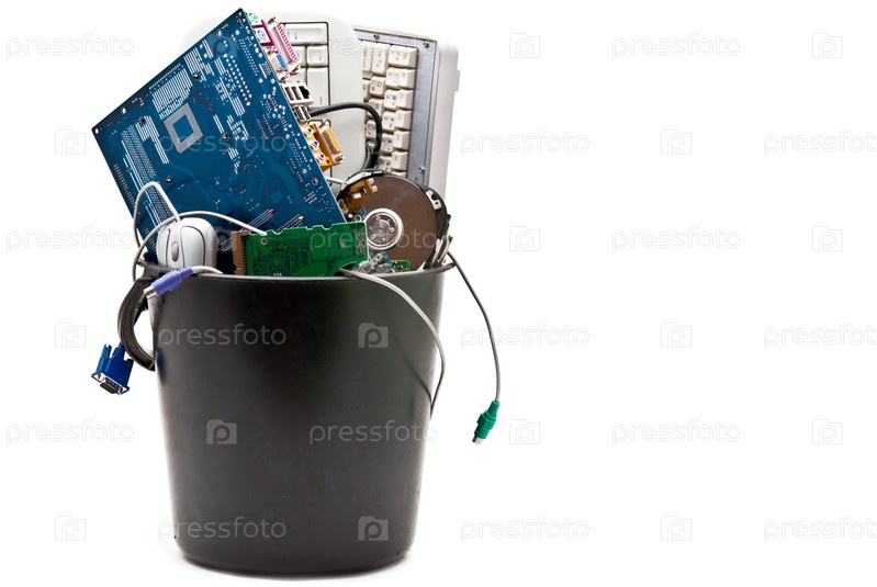 Старые компьютерные запчасти в черном ведре на белом фоне