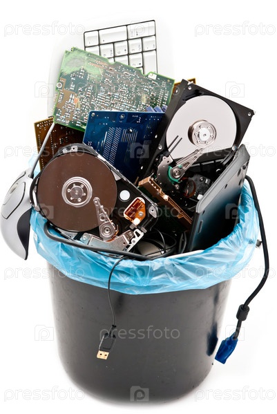 Старые компьютерные запчасти в черном ведре на белом фоне