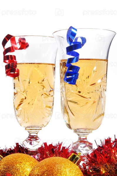 Рождественские и новогодние украшения - шары, черепахи, свечи и бокалы с шампанским