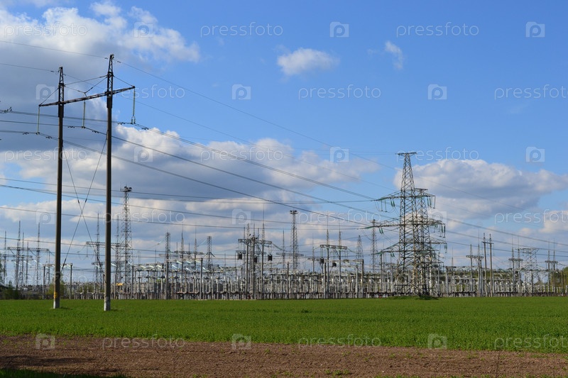 Электрическая подстанция, мачты и столбы с проводами