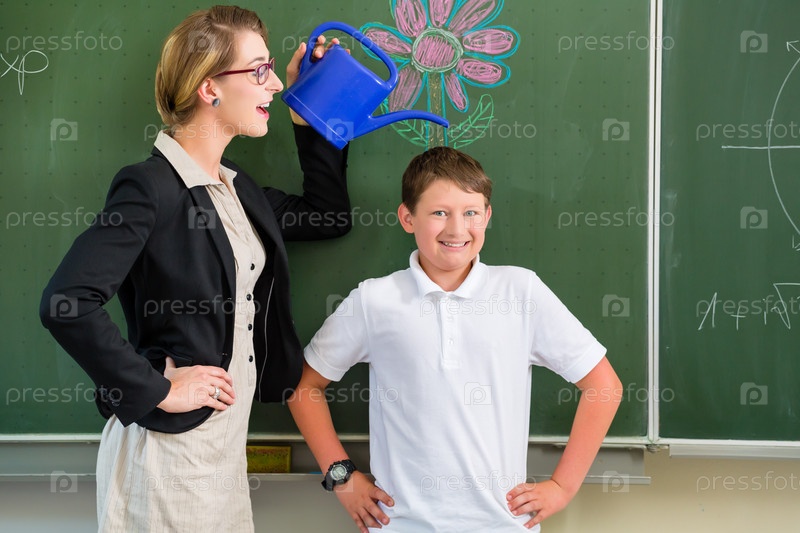 Учитель мотивирует учащегося у доски в классе