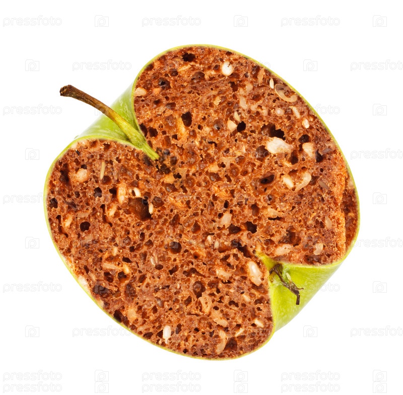 Зеленое яблоко с хлебом внутри на белом фоне