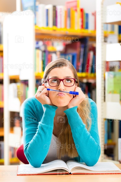 Студентка с кучей книг в библиотеке