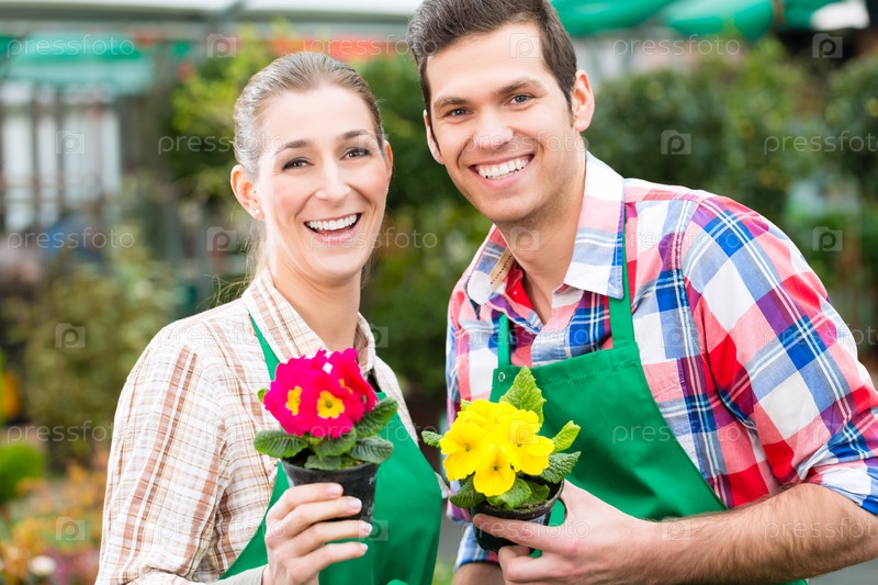 Садовник на цветочном рынке с горшками