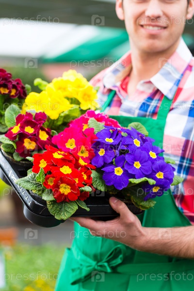 Садовник на цветочном рынке с горшками