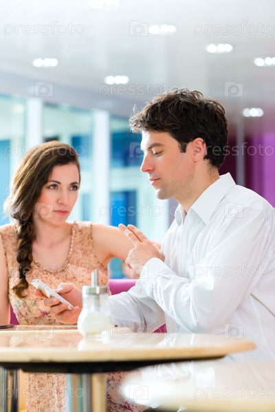 Молодая пара в кафе с телефоном