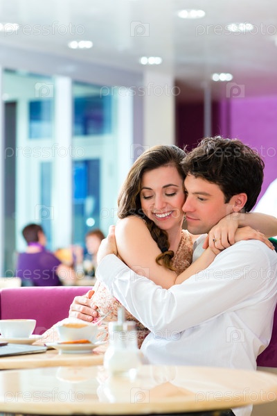 Молодая пара обнимается и целуется в кафе