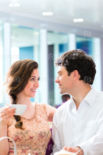 Молодая пара пьет кофе в кафе