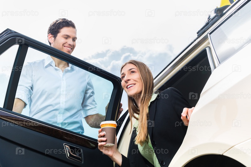 Молодая деловая женщина выходит из такси