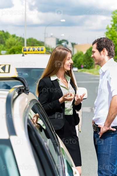 Водитель такси и пассажирка перед автомобилем