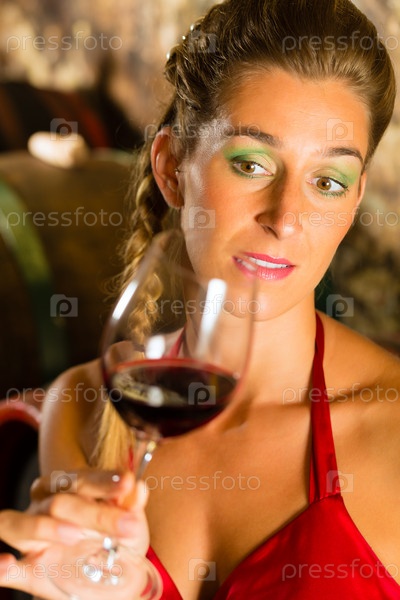 Женщина держит бокал вина в погребе и смотрит скептически