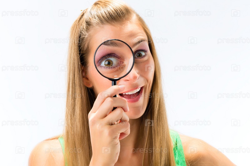 Женщина смотрит через увеличительное стекло