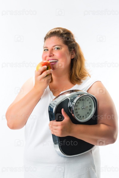 Толстая женщина с весами и яблоком