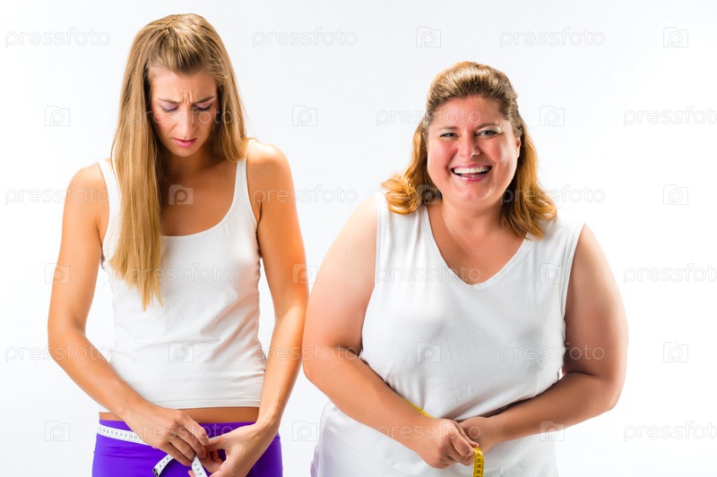 Толстая и худая женщины измеряют себя сантиметровой лентой