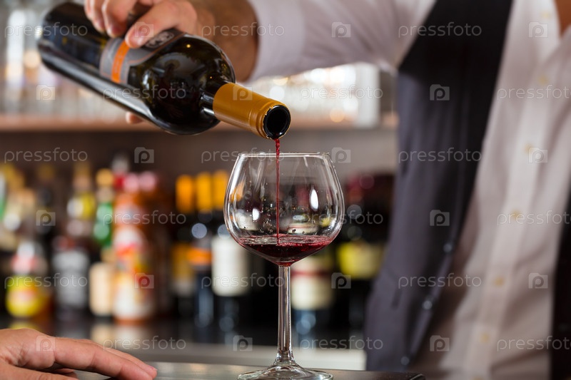 Красное вино льется в бокал в баре