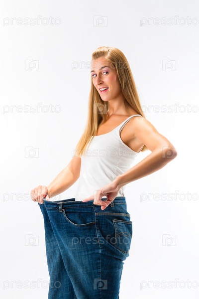 Женщина в слишком больших джинсах после похудания