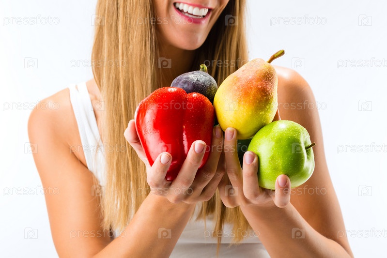Счастливая женщина с фруктами и овощами