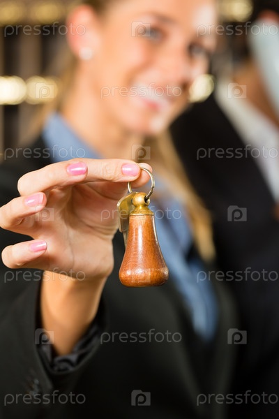 Женщина держит ключи перед стойкой регистрации в отеле