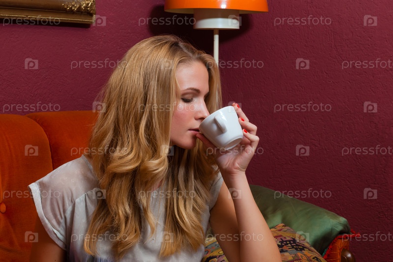 Молодая женщина сидит на диване и пьет кофе