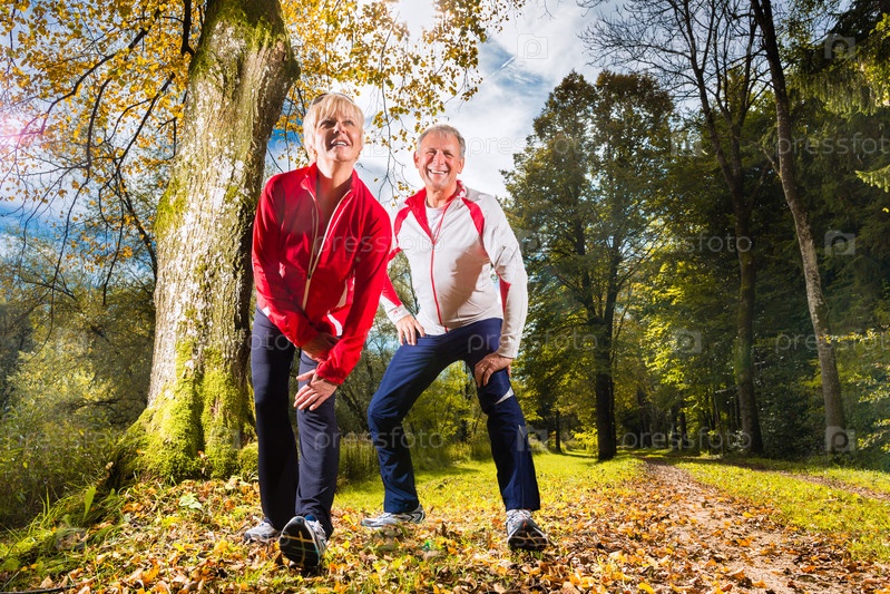 Пожилые люди в спортивной одежде на лесной дорожке