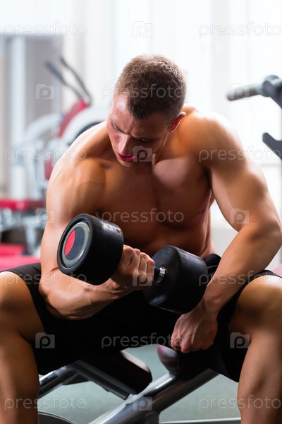 Культурист с гантелью в тренажерном зале