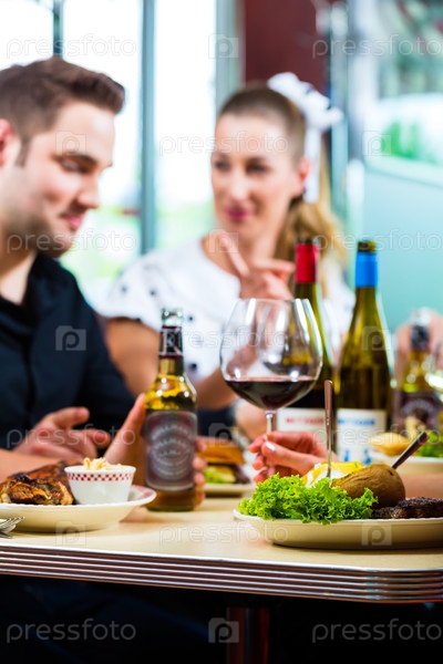 Друзья едят и пьют в ресторане быстрого питания