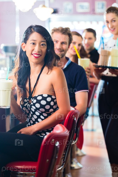 Люди в американской закусочной или ресторане с молочным коктейлем