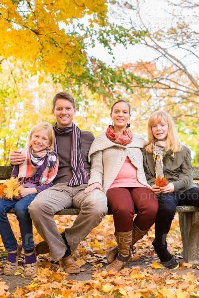 Семья сидит на скамейке осенью