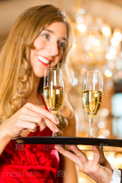 Официант приносит фужеры на подносе в ресторане изысканной кухни, и женщина берет бокал