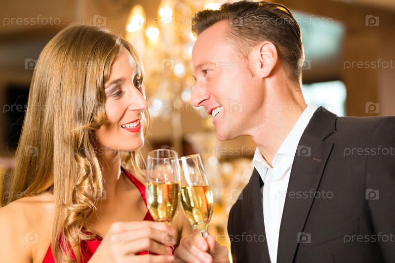 Пара, мужчина и женщина, пьют шампанское в ресторане изысканной кухни