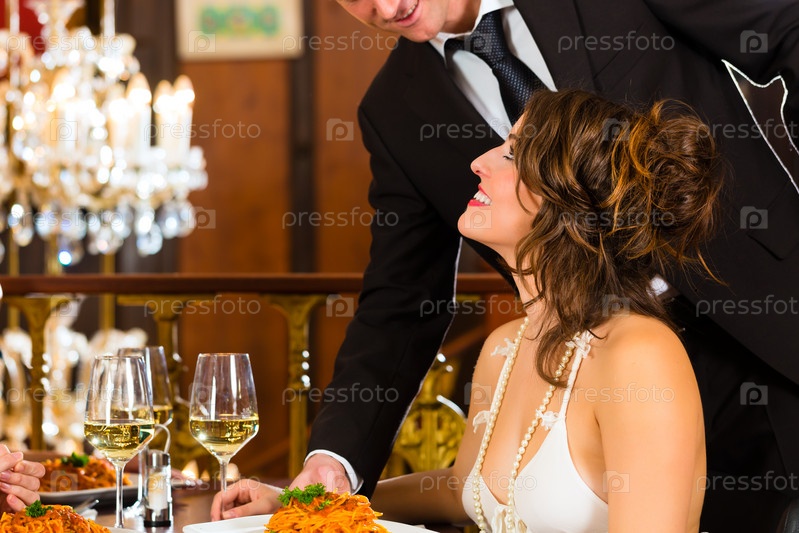Красивая женщина сидит за столиком в ресторане изысканной кухни, официант подает обед