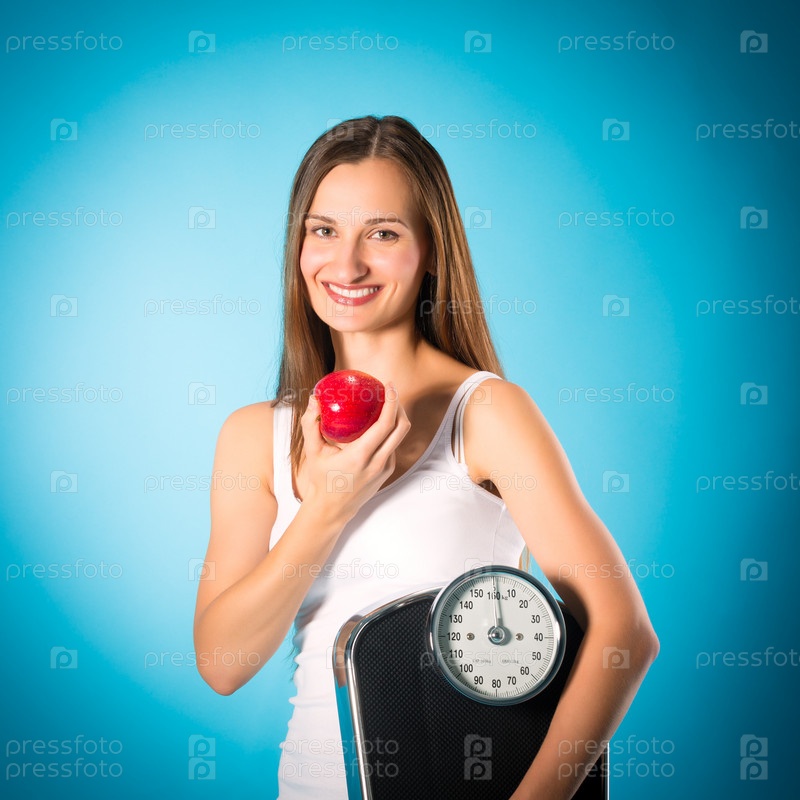 Молодая женщина с весами и яблоком