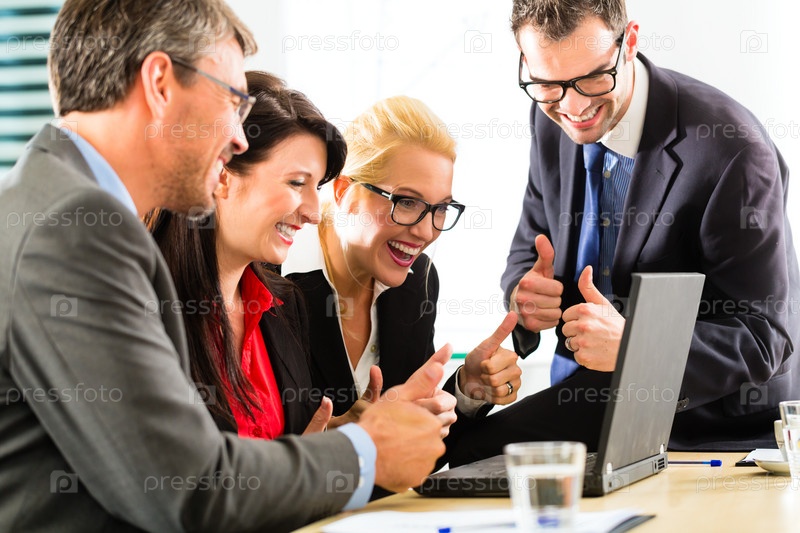 Успешные деловые люди смотрят на экран ноутбука