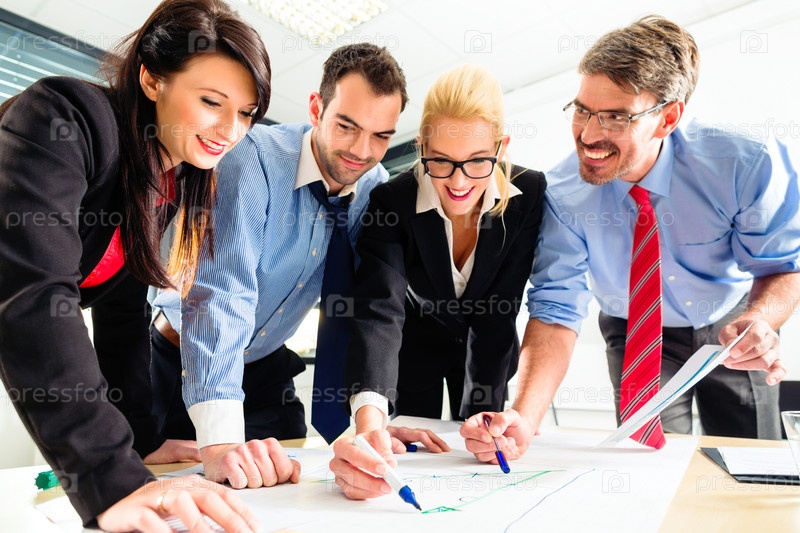 Четыре специалиста совещаются по поводу стратегии развития компании